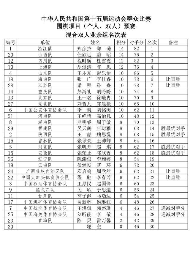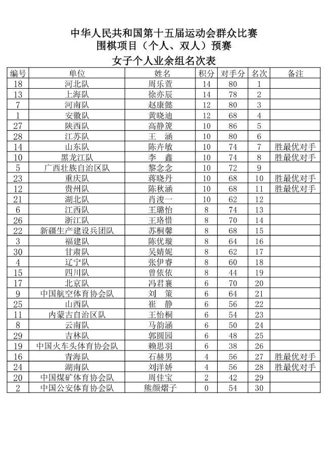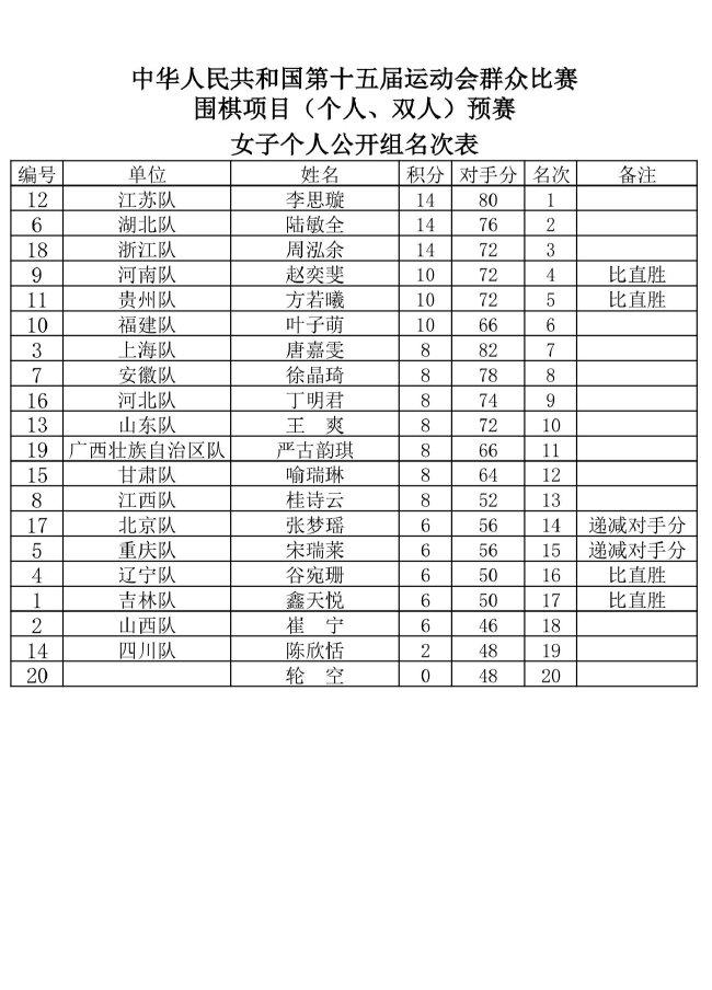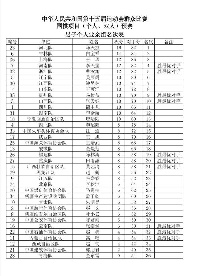 9月10日,中华人民共和国第十五届运动会群众比赛围棋项目(个人、双人)预赛在上海市奉贤区大船酒店结束了全部八轮的比赛,各组晋级决赛的名单的出炉。男子个人公开组中著名棋手柯洁四胜四负,遗憾无缘全运会决赛。