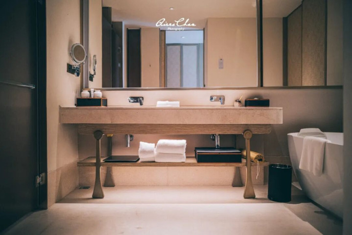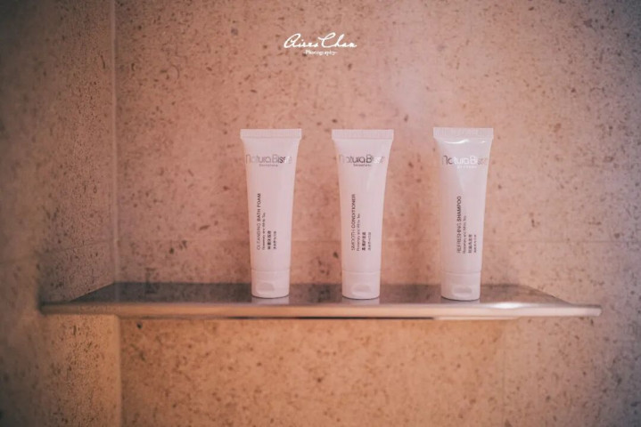 客房内标配浴缸及双盥洗盆,备品用的是来自西班牙的Natura Bissé悦碧施,同时也提供相儿童洗护备品。