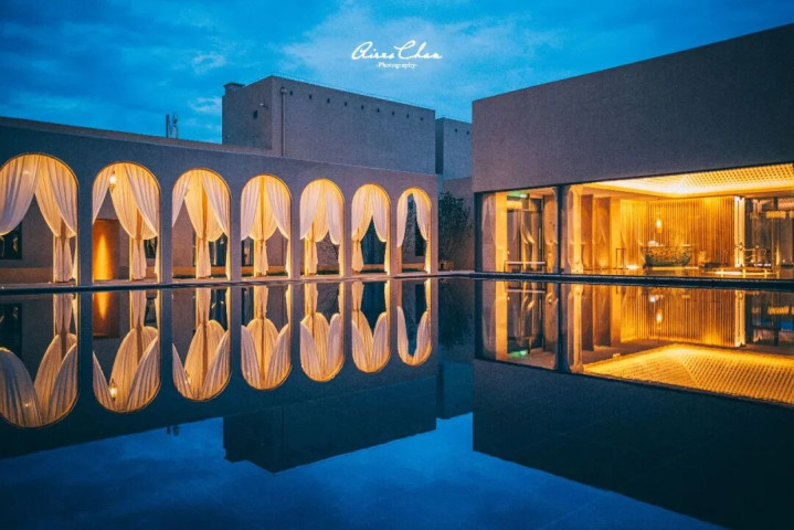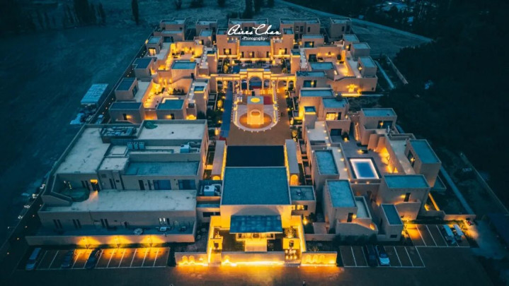 酒店采用组群式建筑布局,既呼应了西北传统民居的聚落形态,又最大程度减少了对自然景观的视觉压迫。