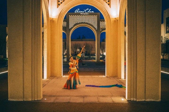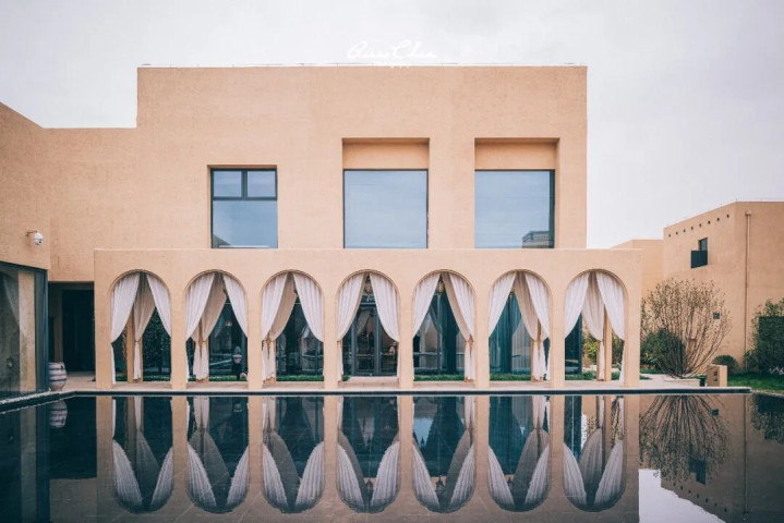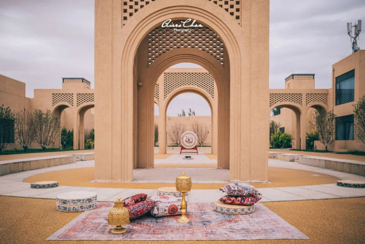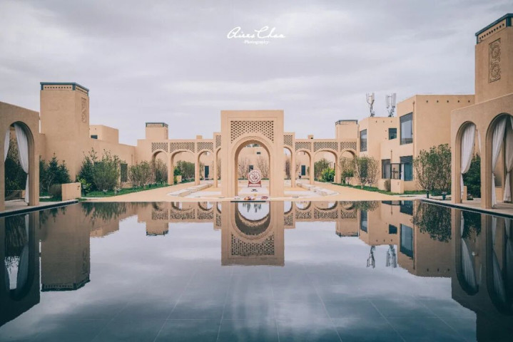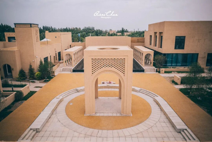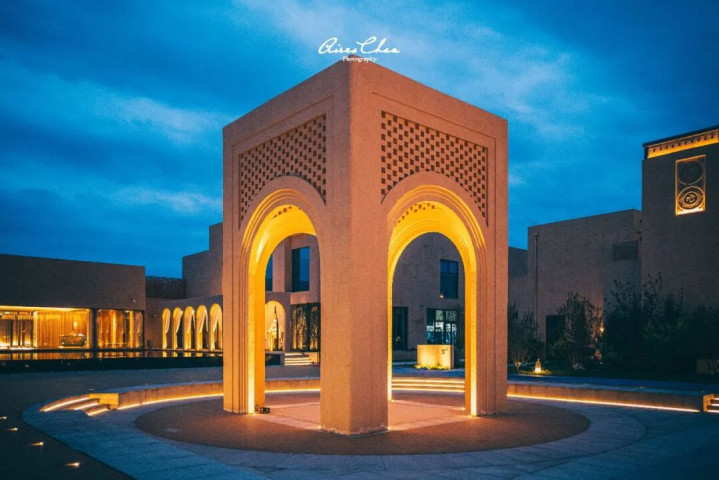 古朴的夯土墙体像是大漠岁月的守护者,与流畅几何线条呼应,建筑与沙土浑然一体,展现出沙漠的苍茫厚重。