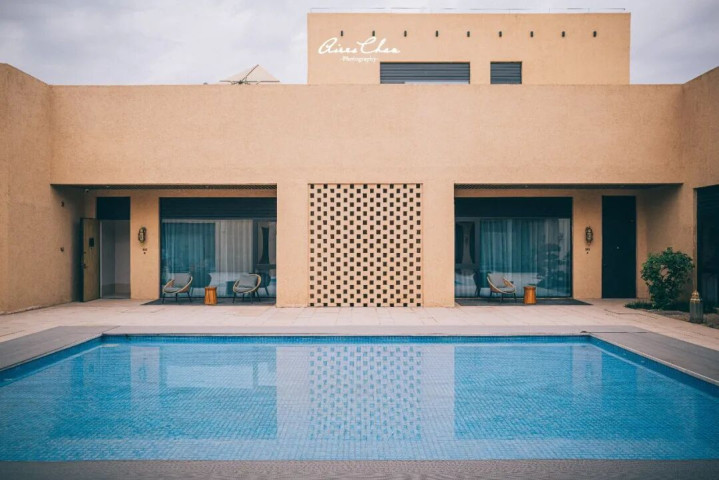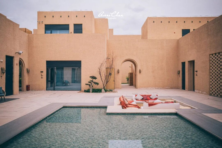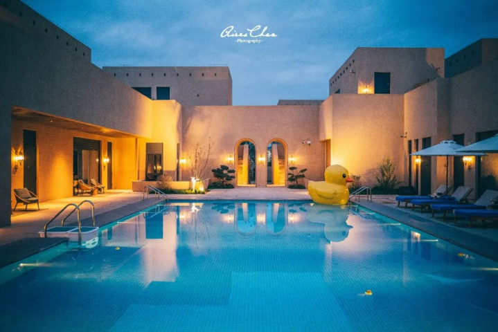 院落的水景柔化了建筑硬朗的外表,公共泳池为亲子家庭提供了休闲空间,可以畅享沙漠之中玩水的惬意。