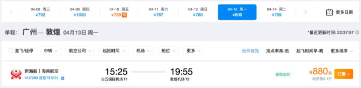 多说一句航班的问题,海航在上个月开通了广州-敦煌的直飞航班,每周一、三、五、日往返直飞,实际飞行时间4小时左右。