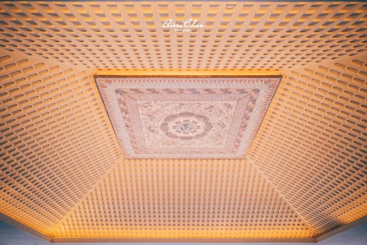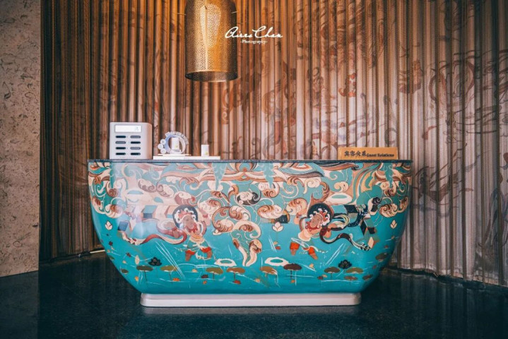 大堂屋顶仿造莫高窟构建了覆斗形穹顶,同时使用金箔叠彩工艺打,复原了407窟「三兔共耳」壁画纹样,在日夜光影的变化之下,让客人提前领略莫高窟壁画的魅力。