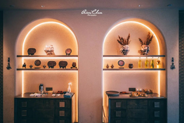 酒店还有晨钟暮鼓仪式,早上会在大堂的下沉广场表演水中太极,傍晚则会点燃篝火举行入夜仪式,对于外地游客来说也是非常有吸引力的体验项目。