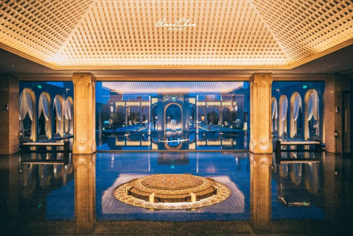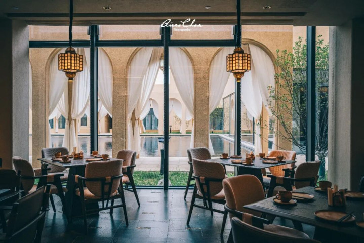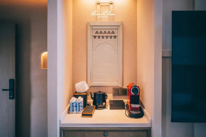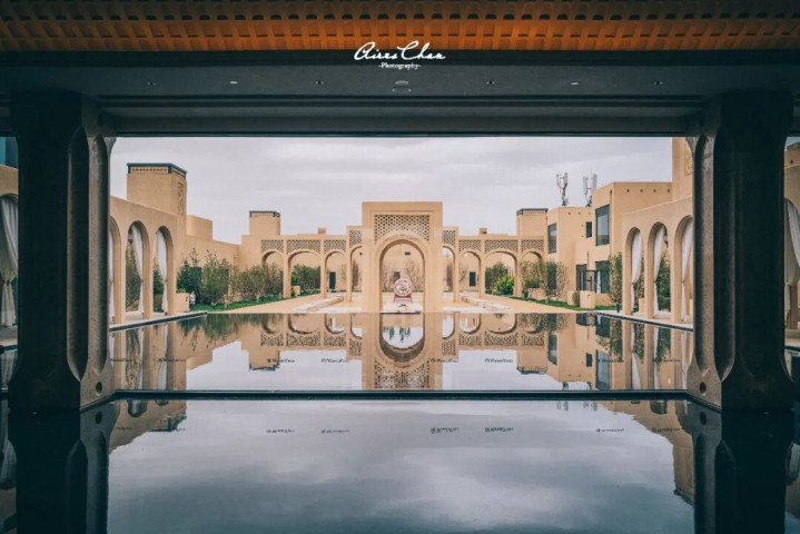 沙漠之中最宝贵的资源就是水,敢曼万达文华在酒店内也有很多水系设计,在黄沙戈壁之中营造出「沙漠绿洲」的既视感,不仅调节了微气候,更成为了绝佳的拍照打卡点。
