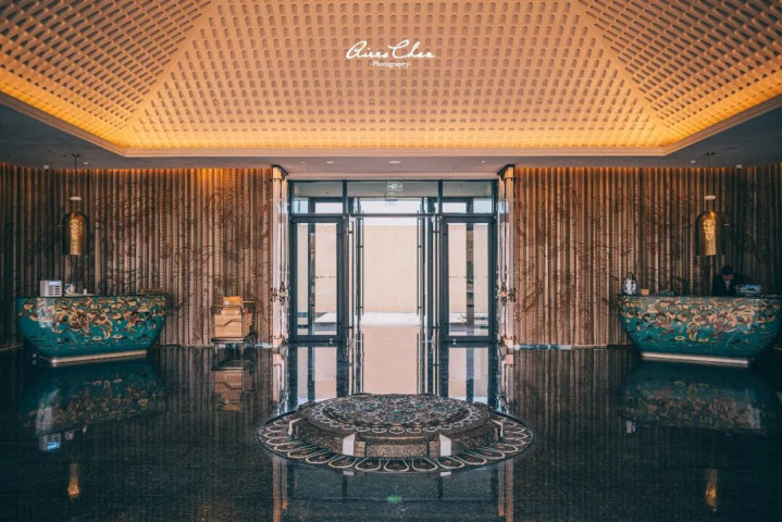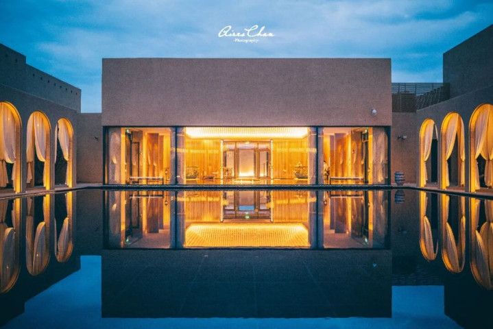 酒店的外观以大地色调为底,融合敦煌莫高窟禅意美学与现代建筑语言。