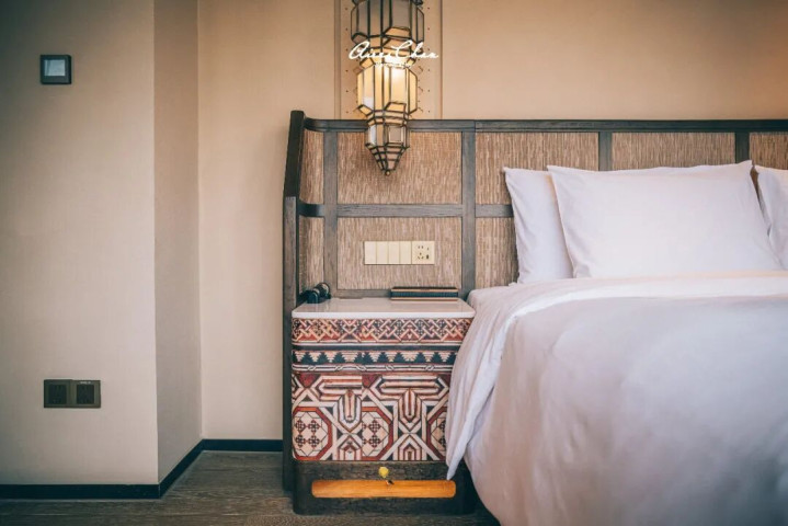 客房采极简设计,浅沙色亚麻织物与木制家具相映,营造出浑然天成的沙漠居所。