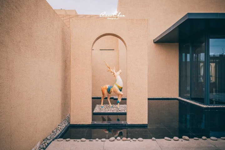 ▲ 酒店门口有一个九色鹿雕塑,和动画片《九色鹿》里的主角形象如出一辙,它的原型是敦煌莫高窟第257窟北魏壁画《鹿王本生图》中的鹿王形象