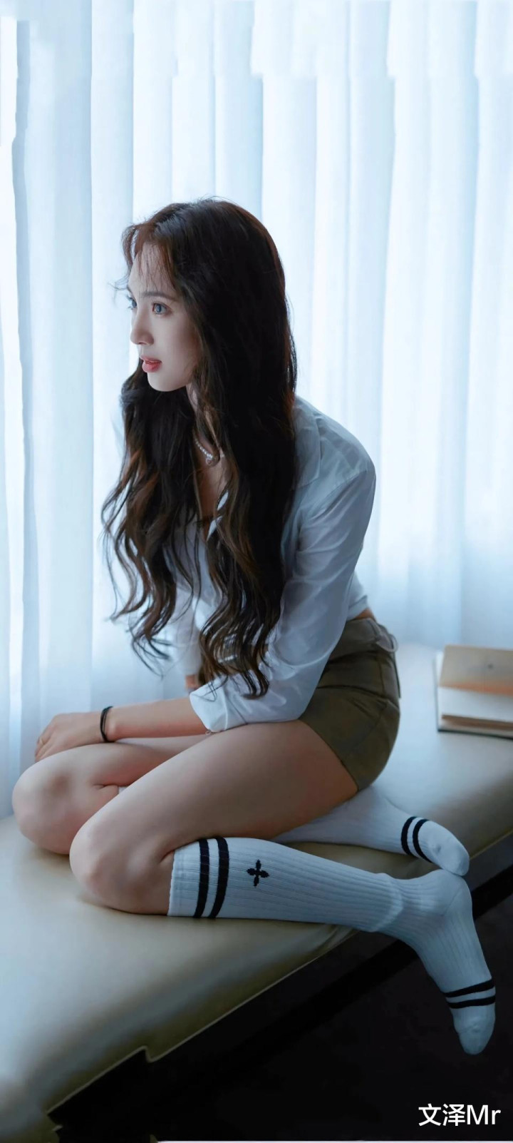 王紫璇侧坐在那里,长发如瀑,眼神望向远方,自带一种文艺氛围感。白衬衫的袖口随意挽起,露出纤细的手腕,细节处尽显随性与优雅。
