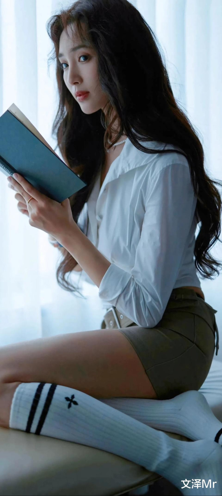 慵懒地坐在窗前,多了几分松弛感。那双带有条纹的长袜,为整体造型注入了青春活力,打破了基础款穿搭的沉闷。她面带微笑,仿佛在享受一段悠闲的时光,这样的她,既有着时尚达人的精致,又有着邻家女孩的亲和。